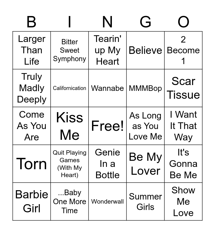 This bingo card has a free space and 40 words: Smells Like Teen Spirit, Come As You Are, Under the Bridge, Californication, ...Baby One More Time, Genie In a Bottle, Wannabe, Say You'll Be There, 2 Become 1, Torn, Kiss Me, Believe, Show Me Love, I Want It That Way, As Long as You Love Me, Quit Playing Games (With My Heart), Everybody (Backstreet's Back), Larger Than Life, Bye Bye Bye, Tearin' up My Heart, It's Gonna Be Me, Summer Girls, MMMBop, Truly Madly Deeply, I Knew I Loved You, Lovefool, All I Wanna Do, If It Makes You Happy, Soak Up The Sun, I'm Like A Bird, You Get What You Give, Barbie Girl, Blue (Da Ba Dee), Be My Lover, Scar Tissue, Wonderwall, Champagne Supernova, Don't Look Back In Anger, Bitter Sweet Symphony and Iris.