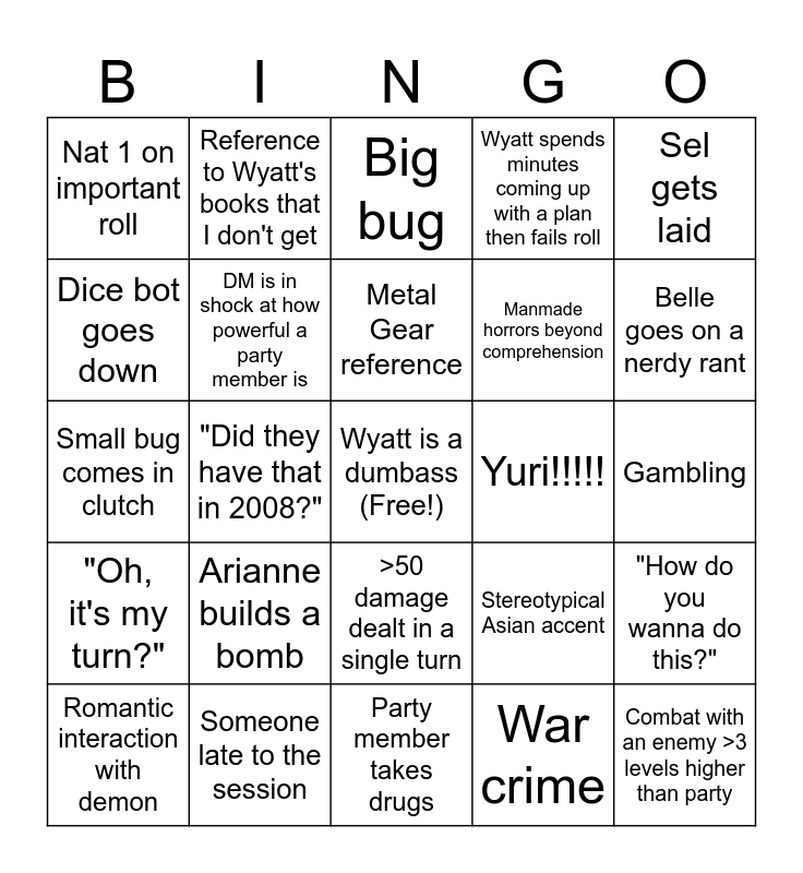 This bingo card has a free space and 24 words: Arianne builds a bomb, Someone late to the session, Metal Gear reference, Romantic interaction with demon, Sel gets laid, Nat 1 on important roll, Dice bot goes down, Reference to Wyatt's books that I don't get, Yuri!!!!!, >50 damage dealt in a single turn, Manmade horrors beyond comprehension, Small bug comes in clutch, Stereotypical Asian accent, "How do you wanna do this?", DM is in shock at how powerful a party member is, War crime, Gambling, Big bug, Belle goes on a nerdy rant, "Did they have that in 2008?", Combat with an enemy >3 levels higher than party, "Oh, it's my turn?", Wyatt spends minutes coming up with a plan then fails roll and Party member takes drugs.
