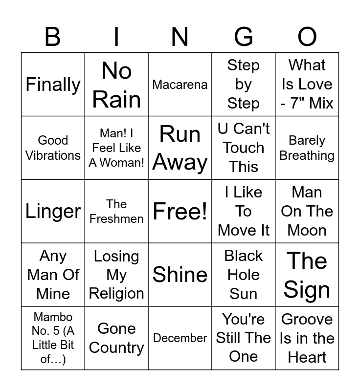 This bingo card has a free space and 60 words: Livin' On Love, Gone Country, Love Can Build A Bridge, Any Man Of Mine, You're Still The One, From This Moment On, Man! I Feel Like A Woman!, Ice Ice Baby, U Can't Touch This, 2 Legit 2 Quit, Step by Step, Hangin' Tough, Good Vibrations, Rhythm Is a Dancer, Gonna Make You Sweat (Everybody Dance Now), Finally, Groove Is in the Heart, What Is Love - 7" Mix, Another Night, Run Away, I Like To Move It, Macarena, Mambo No. 5 (A Little Bit of…), The Sign, All That She Wants, Don't Turn Around, Truly Madly Deeply, Everything You Want, Barely Breathing, I'll Be, Save Tonight, Tubthumping, She Talks To Angels, Hard To Handle, No Rain, My Hero, One Headlight, The Freshmen, Flagpole Sitta, Linger, Zombie, Losing My Religion, Man On The Moon, Shiny Happy People, Black Hole Sun, Spoonman, Hunger Strike, Plush, Interstate Love Song, Shine, December, Mr. Jones, A Long December, Round Here, Smooth, Ironic, Hand in My Pocket, Black or White, My Heart Will Go On and Because You Loved Me.