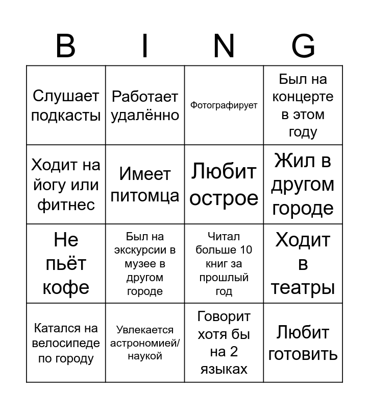 This bingo card has 30 words: Любит рисовать, Пишет дневник, Ходит в театры, Участвовал в волонтёрстве, Слушает подкасты, Фотографирует, Любит острое, Танцевал на сцене, Увлекается астрономией/наукой, Умеет решать кубик Рубика, Говорит хотя бы на 2 языках, Катался на велосипеде по городу, Работал/учился за границей, Катался на лодке/байдарке, Был на экскурсии в музее в другом городе, Путешествовал автостопом, Любит готовить десерты, Любит готовить, Учит иностранный язык, Ходит на йогу или фитнес, Читал больше 10 книг за прошлый год, Играет на музыкальном инструменте, Работает удалённо, Не пьёт кофе, Имеет питомца, Был на концерте в этом году, Любит настольные игры, Умеет кататься на коньках, Жил в другом городе and Ходит пешком больше 10 000 шагов в день.
