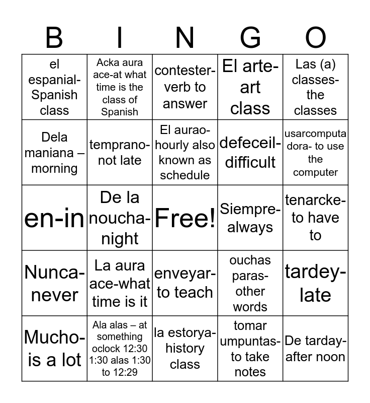 This bingo card has a free space and 24 words: La aura ace-what time is it, Ala alas – at something oclock 12:30 1:30 alas 1:30 to 12:29, El aurao- hourly also known as schedule, Mucho- is a lot, Las (a) classes- the classes, el espanial- Spanish class, Dela maniana – morning, Acka aura ace-at what time is the class of Spanish, Siempre- always, enveyar- to teach, defeceil- difficult, en-in, ouchas paras- other words, tardey- late, temprano- not late, tomar umpuntas- to take notes, tenarcke- to have to, contester- verb to answer, usarcomputa dora- to use the computer, De la noucha- night, De tarday- after noon, Nunca- never, El arte- art class and la estorya- history class.