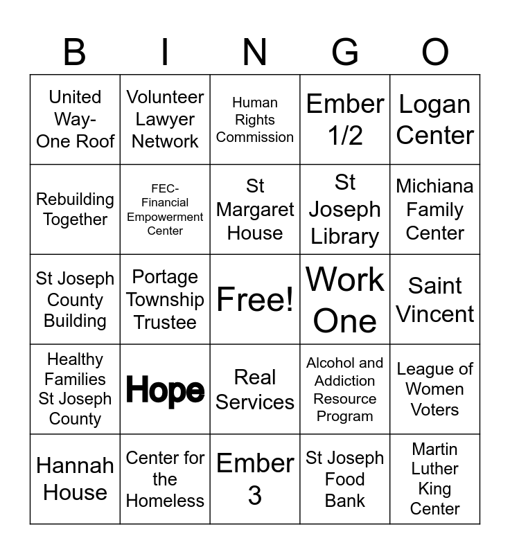 This bingo card has a free space and 24 words: Hope, Center for the Homeless, St Margaret House, Hannah House, Logan Center, United Way- One Roof, Rebuilding Together, Volunteer Lawyer Network, Work One, Real Services, St Joseph Library, St Joseph County Building, Alcohol and Addiction Resource Program, League of Women Voters, FEC- Financial Empowerment Center, St Joseph Food Bank, Saint Vincent, Human Rights Commission, Michiana Family Center, Portage Township Trustee, Martin Luther King Center, Healthy Families St Joseph County, Ember 1/2 and Ember 3.