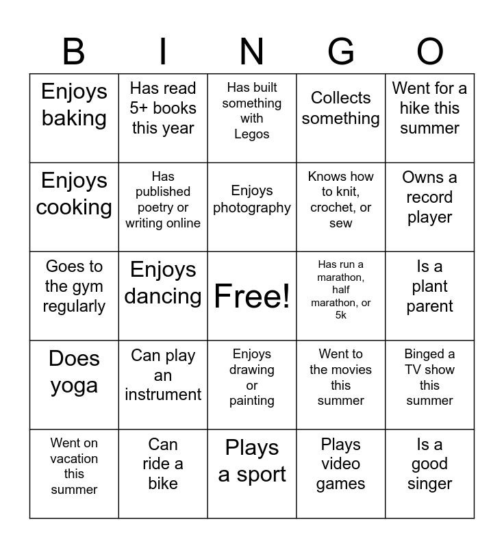 This bingo card has a free space and 25 words: Can play an instrument, Plays a sport, Enjoys photography, Went on vacation this summer, Went for a hike this summer, Enjoys baking, Enjoys cooking, Has read 5+ books this year, Has run a marathon, half marathon, or 5k, Enjoys drawing or painting, Knows how to knit, crochet, or sew, Goes to the gym regularly, Went to the movies this summer, Binged a TV show this summer, Has published poetry or writing online, Makes TikToks/IG Reels, Is a plant parent, Has built something with Legos, Owns a record player, Enjoys dancing, Is a good singer, Can ride a bike, Does yoga, Collects something and Plays video games.