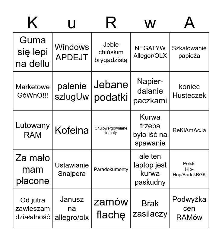 This bingo card has a free space and 24 words: Ustawianie Snajpera, Janusz na allegro/olx, Jebane podatki, Od jutra zawieszam działalność, Szkalowanie papieża, Guma się lepi na dellu, Marketowe GóWnO!!!, Windows APDEJT, Kurwa trzeba było iść na spawanie, Paradokumenty, Napier-dalanie paczkami, Lutowany RAM, ale ten laptop jest kurwa paskudny, Polski Hip-Hop/BartekBGK, palenie szlugUw, Brak zasilaczy, ReKlAmAcJa, Jebie chińskim brygadzistą, koniec Husteczek, Kofeina, Podwyżka cen RAMów, Za mało mam płacone, NEGATYW Allegor/OLX and zamów flachę.