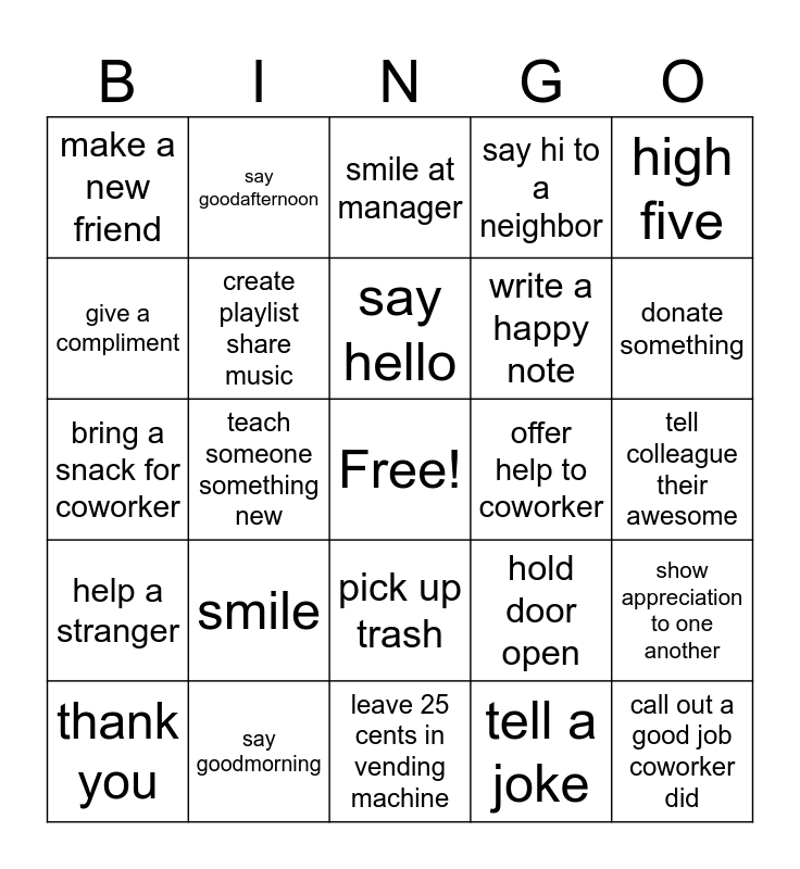 This bingo card has a free space and 24 words: smile, say goodmorning, say hello, thank you, high five, make a new friend, give a compliment, say goodafternoon, offer help to coworker, pick up trash, write a happy note, bring a snack for coworker, hold door open, show appreciation to one another, create playlist share music, tell a joke, tell colleague their awesome, smile at manager, donate something, teach someone something new, call out a good job coworker did, help a stranger, say hi to a neighbor and leave 25 cents in vending machine.