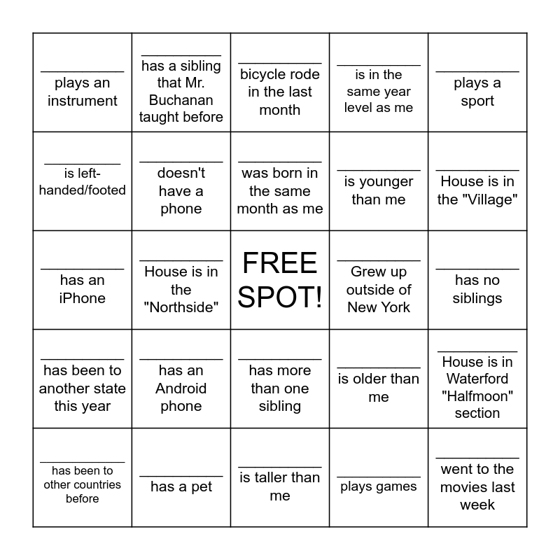 This bingo card has a free space and 26 words: __________ has more than one sibling, ___________ plays games, __________ was born in the same month as me, __________ has a pet, __________ plays a sport, __________ plays an instrument, __________ is left-handed/footed, __________ has a sibling that Mr. Buchanan taught before, __________ has no siblings, __________ is older than me, __________ is younger than me, __________ has an iPhone, __________ House is in Waterford "Halfmoon" section, _____________ has been to other countries before, __________ House is in the "Northside", __________ Sings or dances regularly, ___________ is in the same year level as me, __________ has been to another state this year, __________ bicycle rode in the last month, __________ went to the movies last week, __________ House is in the "Village", __________ is taller than me, __________ Grew up outside of New York, __________ has an Android phone, __________ doesn't have a phone and __________ has no siblings.