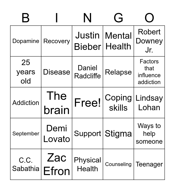 This bingo card has a free space and 24 words: Demi Lovato, Zac Efron, Daniel Radcliffe, C.C. Sabathia, Robert Downey Jr., Dopamine, 25 years old, Recovery, Coping skills, Support, Relapse, Addiction, Stigma, Ways to help someone, Disease, Counseling, Lindsay Lohan, Justin Bieber, Factors that influence addiction, The brain, Teenager, September, Mental Health and Physical Health.