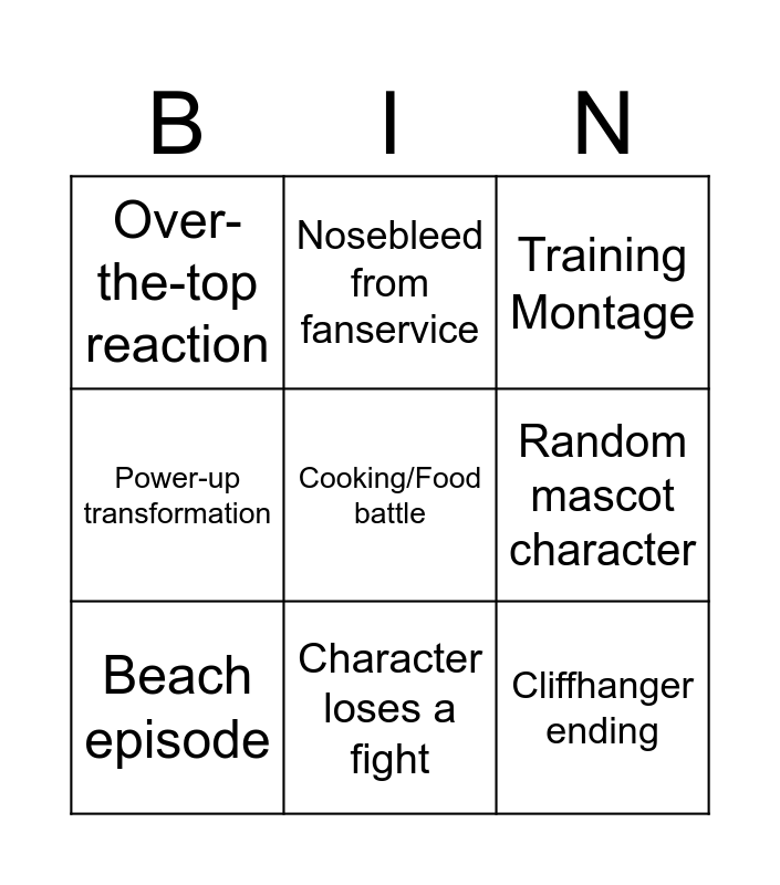 This bingo card has a free space and 9 words: Beach episode, Training Montage, Nosebleed from fanservice, Power-up transformation, Over-the-top reaction, Random mascot character, Cliffhanger ending, Festival with fireworks and Character loses a fight.