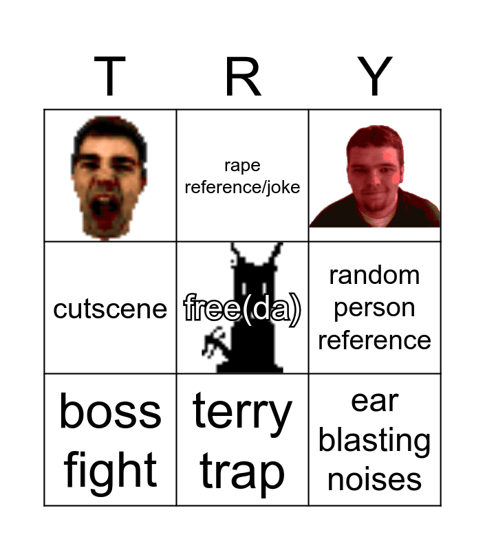 This bingo card has 2 images, a free space and 8 words: terry trap, ear blasting noises, cutscene, boss fight, rape reference/joke, romero head, random person reference and icon of sin explosion.