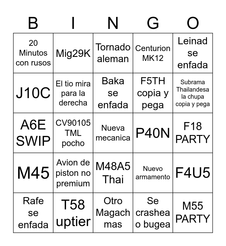 This bingo card has a free space and 24 words: Avion de piston no premium, T58 uptier, Baka se enfada, Rafe se enfada, Leinad se enfada, 20 Minutos con rusos, J10C, Mig29K, P40N, M48A5 Thai, F5TH copia y pega, A6E SWIP, Nuevo armamento, F4U5, El tio mira para la derecha, Se crashea o bugea, F18 PARTY, Tornado aleman, Subrama Thailandesa la chupa copia y pega, CV90105 TML pocho, M55 PARTY, M45, Centurion MK12 and Otro Magach mas.