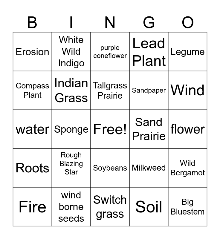 This bingo card has a free space and 49 words: Bur Oak, Big Bluestem, Rattlesnake Master, Switch grass, Rough Blazing Star, Prairie Dock, White Wild Indigo, Black-eyed Susan, Compass Plant, Cup Plant, Indian Grass, Lead Plant, Wild Bergamot, Milkweed, Illinois Tick Trefoil, Shooting Star, Tallgrass Prairie, Sand Prairie, New England Aster, Legume, Sponge, Soil, Erosion, Sandpaper, Prevent water loss, Wind, Fire, Corn, Soybeans, Roots, Corky Bark, Evaporation, Seeds, Germinate, wind borne seeds, Country Road, leaves, stem, flower, Monarch Butterfly, bison, silphium, backroads or country roads, sod, water, purple coneflower, sun/ sunshine/ sunlight, Drummer Silty Clay Loam and corn.