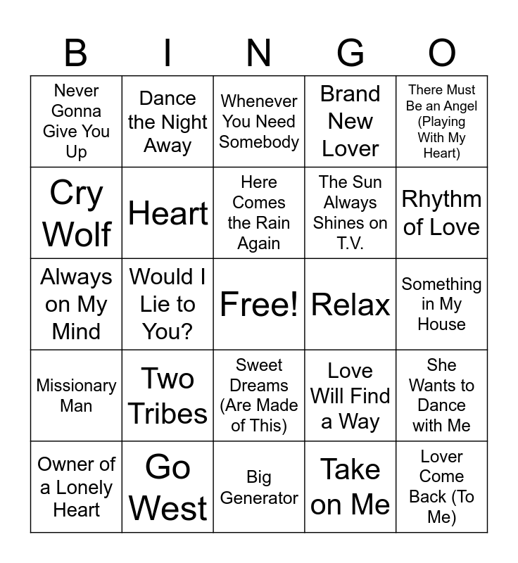 This bingo card has a free space and 40 words: It’s a Sin, Always on My Mind, What Have I Done to Deserve This?, Heart, Go West, Sweet Dreams (Are Made of This), Here Comes the Rain Again, Love Is a Stranger, There Must Be an Angel (Playing With My Heart), Missionary Man, Would I Lie to You?, Brand New Lover, Lover Come Back (To Me), Something in My House, Relax, Two Tribes, Welcome to the Pleasuredome, Never Gonna Give You Up, Together Forever, Whenever You Need Somebody, She Wants to Dance with Me, Take on Me, The Sun Always Shines on T.V., Cry Wolf, Hunting High and Low, Stay on These Roads, Africa, Rosanna, Hold the Line, I’ll Be Over You, 99, Owner of a Lonely Heart, Leave It, Love Will Find a Way, Rhythm of Love, Big Generator, Jump, Panama, Dance the Night Away and I’ll Wait.