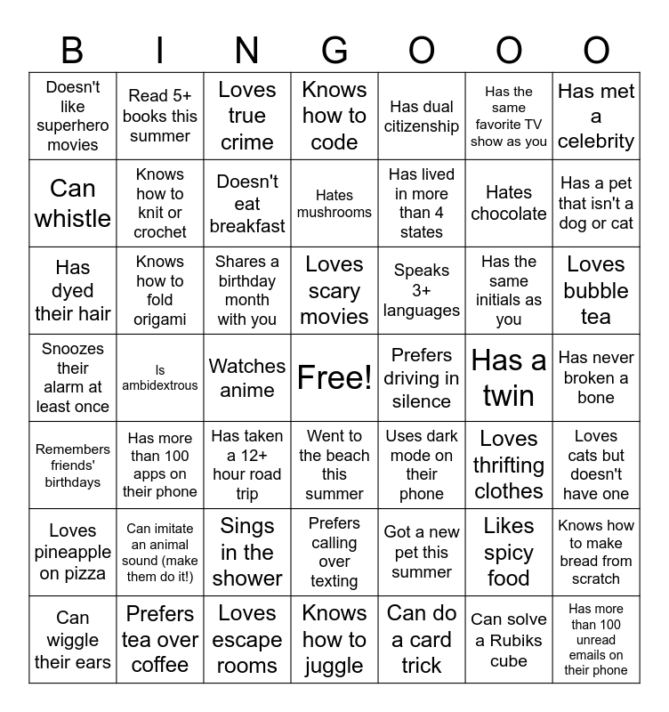 This bingo card has a free space and 48 words: Got a new pet this summer, Hates chocolate, Knows how to juggle, Is ambidextrous, Shares a birthday month with you, Has never broken a bone, Read 5+ books this summer, Prefers tea over coffee, Has the same favorite TV show as you, Went to the beach this summer, Has met a celebrity, Knows how to code, Has the same initials as you, Speaks 3+ languages, Loves pineapple on pizza, Has a twin, Can whistle, Has a pet that isn't a dog or cat, Likes spicy food, Has dual citizenship, Has lived in more than 4 states, Watches anime, Doesn't like superhero movies, Knows how to knit or crochet, Knows how to make bread from scratch, Doesn't eat breakfast, Loves bubble tea, Can wiggle their ears, Loves scary movies, Knows how to fold origami, Can solve a Rubiks cube, Prefers driving in silence, Loves cats but doesn't have one, Can imitate an animal sound (make them do it!), Snoozes their alarm at least once, Uses dark mode on their phone, Loves thrifting clothes, Has dyed their hair, Has taken a 12+ hour road trip, Sings in the shower, Remembers friends' birthdays, Has more than 100 unread emails on their phone, Loves true crime, Loves escape rooms, Hates mushrooms, Prefers calling over texting, Has more than 100 apps on their phone and Can do a card trick.