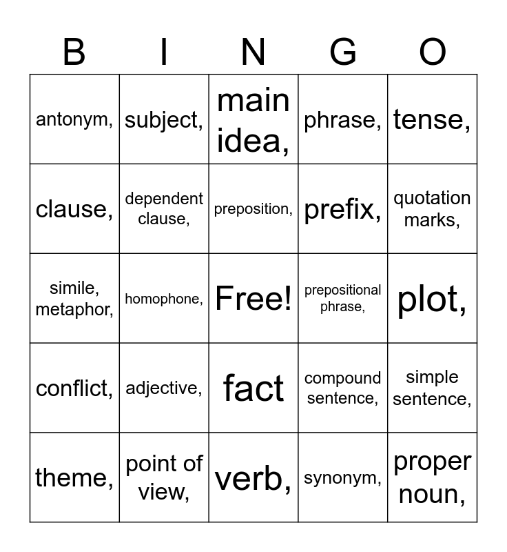 This bingo card has a free space and 51 words: noun, proper noun,, pronoun,, verb,, adjective,, Adverb,, subject,, predicate,, clause,, independent clause,, dependent clause,, phrase,, simple sentence,, compound sentence,, complex sentence,, conjunction,, preposition,, prepositional phrase,, subject-verb agreement,, tense,, homophone,, synonym,, antonym,, prefix,, suffix,, root word,, quotation marks,, capitalization,, theme,, main idea,, supporting details,, summary,, inference,, context clues,, character traits,, point of view,, narrator,, dialogue,, comma,, setting,, plot,, conflict,, resolution,, cause and effect,, compare and contrast,, figurative language,, simile, metaphor,, poetry elements,, author's purpose,, fact and opinion..