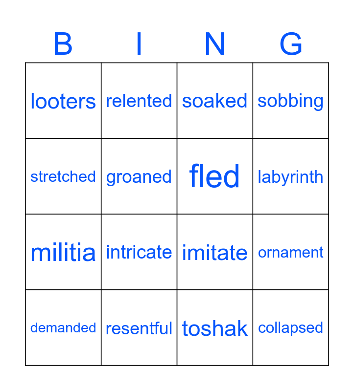 This bingo card has 38 words: whispered, chador, forbade, fled, disrupted, peddlers, labyrinth, conqueror, stretched, militia, ornament, sobbing, demanded, toshak, groaned, collapsed, browsing, soaked, superior, resentful, looters, belonging, intricate, encourage, snob, fumed, encourage, rouse, imitate, flinched, doze, illiterate, pride, relented, fumed, rouse, imitate and flinched.