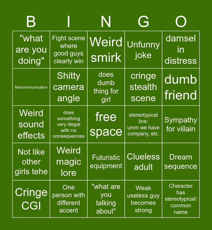 This bingo card has a free space and 50 words: Overdramatic edit, Character has stereotypical/ common name, Predictable plot twist, "what are you talking about", Weird magic lore, Overly edgy joke, Fight scene where good guys clearly win, Weird racial stereotypes, Miscommunication, Overreaction, Shitty camera angle, Unfunny joke, Dream sequence, Clueless adult, Bad decision, Weird ship, does dumb thing for girl, stereotypical line: umm we have company, etc., Dumb thing that adds nothing, damsel in distress, does something very illegal with no consequences, Weak useless guy becomes strong, "what are you doing", cringe stealth scene, Poor line delivery, freezes up around girl, dumb friend, Repeating someones name, Weird smirk, Futuristic equipment, Random expert, Stereotypical highschool cliques, Camera shot of everyone in row looking judgemental, Mean girl becomes nice/has trauma, One person with different accent, Cringy opening pop song, Out of context intro, Cringe female lead, Stupid death scene, Sympathy for villain, Main character has one dead parent or dead partner, Overexaggerated villain, Weird animal sidekick, Weird depiction of teens clearly from boomer perspective, Cringe CGI, Weird sound effects, Attractive but not attractive, Random sexual innuendo, Not like other girls tehe and Hard and unemotional but oh men.