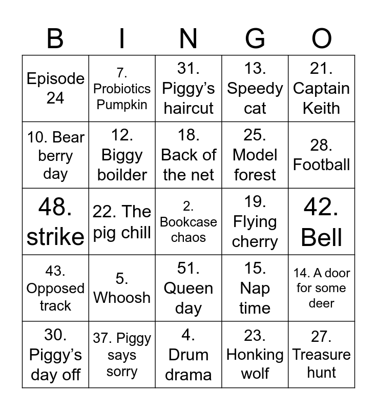 This bingo card has 51 words: 1. Pie party, 2. Bookcase chaos, 3. Egg race, 4. Drum drama, 5. Whoosh, 6. Big top, 7. Probiotics Pumpkin, 9. Green thumb, 10. Bear berry day, 11. Night of the shooting stars, 12. Biggy boilder, 13. Speedy cat, 14. A door for some deer, 15. Nap time, 16. Camping badges,, 17. Flappy snap, 18. Back of the net, 19. Flying cherry, 20. Keen Keith, 21. Captain Keith, 22. The pig chill, 23. Honking wolf, Episode 24, 25. Model forest, 26. Cloud, 27. Treasure hunt, 28. Football, 29. Shoot shoot, 30. Piggy’s day off, 31. Piggy’s haircut, 32. Whoops, 33. Trail indoors, 34. Justic trading, 35. Might, 36. Train going, 37. Piggy says sorry, 38. Nature trail, 39. Spoon, 40. Bathing piggy, 41. There in the world, 42. Bell, 43. Opposed track, 44. Yoga time, 45. Glog jug, 46. Train day, 47. My body, 48. strike, 49. Piggysitting, 50. Sports day, 51. Queen day and 100. Pggy’s christmas.