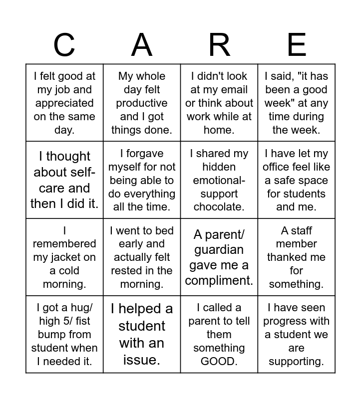 This bingo card has 16 words: I helped a student with an issue., A staff member thanked me for something., I didn't look at my email or think about work while at home., I felt good at my job and appreciated on the same day., I remembered my jacket on a cold morning., My whole day felt productive and I got things done., A parent/ guardian gave me a compliment., I called a parent to tell them something GOOD., I thought about self-care and then I did it., I forgave myself for not being able to do everything all the time., I got a hug/ high 5/ fist bump from student when I needed it., I said, "it has been a good week" at any time during the week., I went to bed early and actually felt rested in the morning., I have let my office feel like a safe space for students and me., I shared my hidden emotional-support chocolate. and I have seen progress with a student we are supporting..