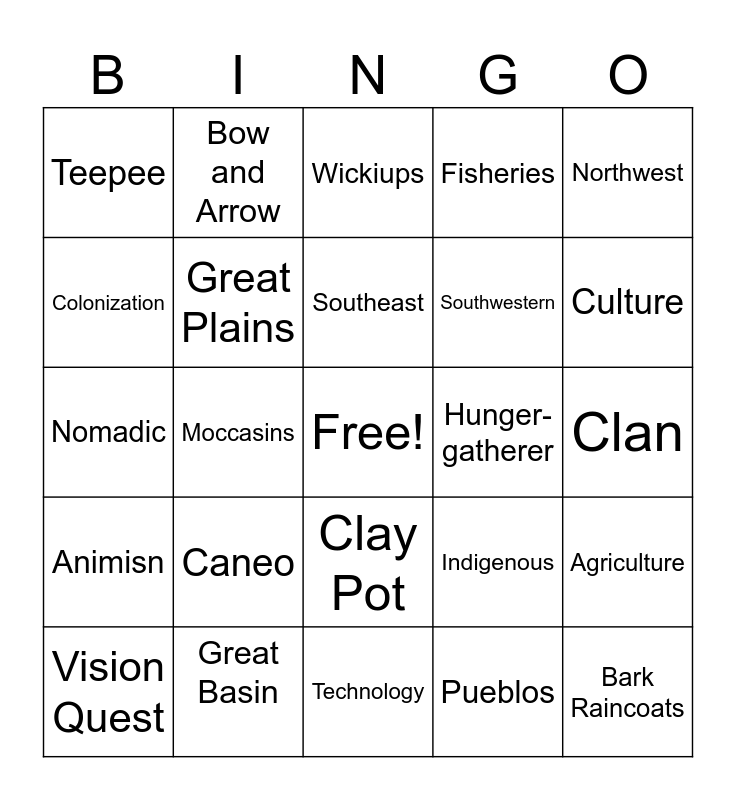 This bingo card has a free space and 24 words: Caneo, Great Basin, Southeast, Vision Quest, Northwest, Teepee, Colonization, Bow and Arrow, Hunger-gatherer, Clay Pot, Southwestern, Nomadic, Indigenous, Agriculture, Great Plains, Pueblos, Clan, Wickiups, Culture, Moccasins, Bark Raincoats, Animisn, Fisheries and Technology.