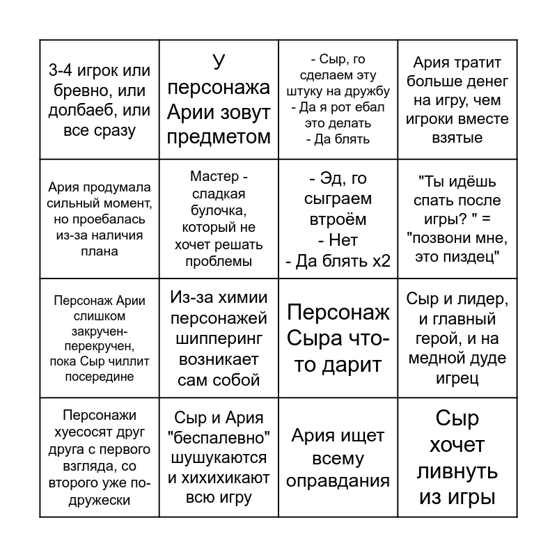 This bingo card has 16 words: Персонажи хуесосят друг друга с первого взгляда, со второго уже по-дружески, Сыр и Ария "беспалевно" шушукаются и хихихикают всю игру, - Сыр, го сделаем эту штуку на дружбу - Да я рот ебал это делать - Да блять, Ария тратит больше денег на игру, чем игроки вместе взятые, Ария продумала сильный момент, но проебалась из-за наличия плана, У персонажа Арии зовут предметом, Персонаж Сыра что-то дарит, Сыр и лидер, и главный герой, и на медной дуде игрец, 3-4 игрок или бревно, или долбаеб, или все сразу, Мастер - сладкая булочка, который не хочет решать проблемы, Ария ищет всему оправдания, "Ты идёшь спать после игры? " = "позвони мне, это пиздец", Персонаж Арии слишком закручен-перекручен, пока Сыр чиллит посередине, Из-за химии персонажей шипперинг возникает сам собой, - Эд, го сыграем втроём - Нет - Да блять х2 and Сыр хочет ливнуть из игры.