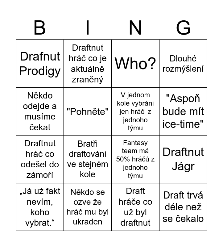 This bingo card has 16 words: Někdo se ozve že hráč mu byl ukraden, Draftnut Jágr, Who?, Drafnut Prodigy, Draftnut hráč co odešel do zámoří, Draftnut hráč co je aktuálně zraněný, Fantasy team má 50% hráčů z jednoho týmu, Draft hráče co už byl draftnut, Někdo odejde a musíme čekat, "Pohněte", „Já už fakt nevím, koho vybrat.“, Dlouhé rozmýšlení, Bratři draftováni ve stejném kole, "Aspoň bude mít ice-time", V jednom kole vybráni jen hráči z jednoho týmu and Draft trvá déle než se čekalo.