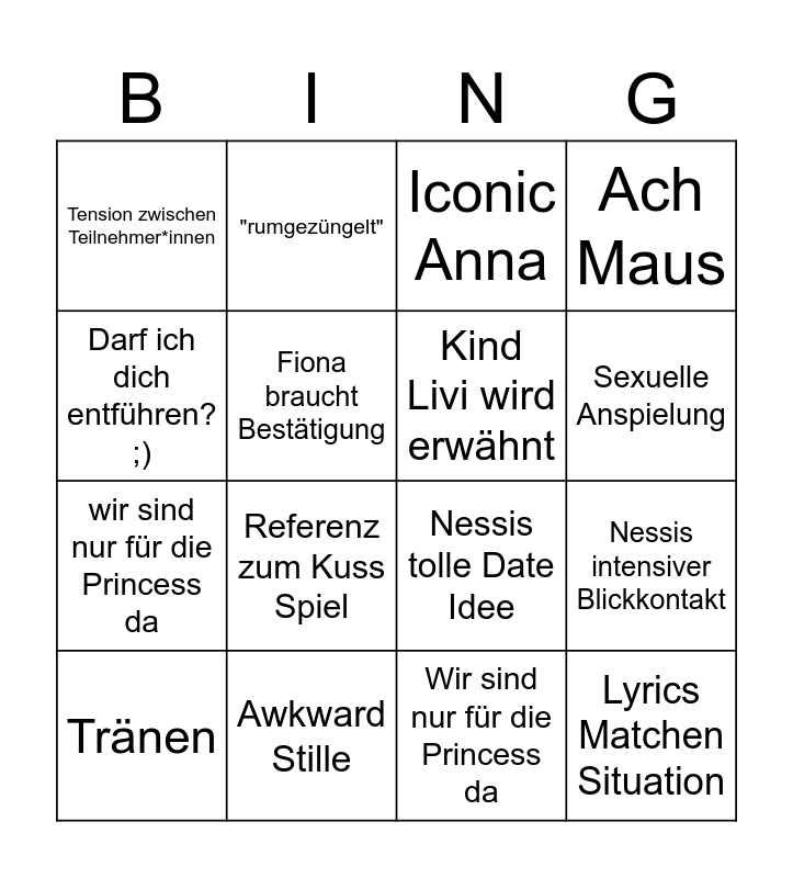 This bingo card has 16 words: Awkward Stille, Nessis intensiver Blickkontakt, Iconic Anna, Tension zwischen Teilnehmer*innen, wir sind nur für die Princess da, "rumgezüngelt", Nessis tolle Date Idee, Wir sind nur für die Princess da, Darf ich dich entführen? ;), Fiona braucht Bestätigung, Tränen, Ach Maus, Referenz zum Kuss Spiel, Sexuelle Anspielung, Kind Livi wird erwähnt and Lyrics Matchen Situation.