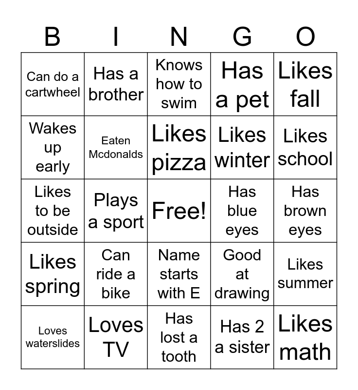 This bingo card has a free space and 24 words: Can ride a bike, Loves TV, Likes pizza, Loves waterslides, Likes fall, Can do a cartwheel, Wakes up early, Has a brother, Has blue eyes, Name starts with E, Likes winter, Likes to be outside, Good at drawing, Likes summer, Eaten Mcdonalds, Has 2 a sister, Has brown eyes, Knows how to swim, Likes school, Plays a sport, Likes math, Likes spring, Has a pet and Has lost a tooth.