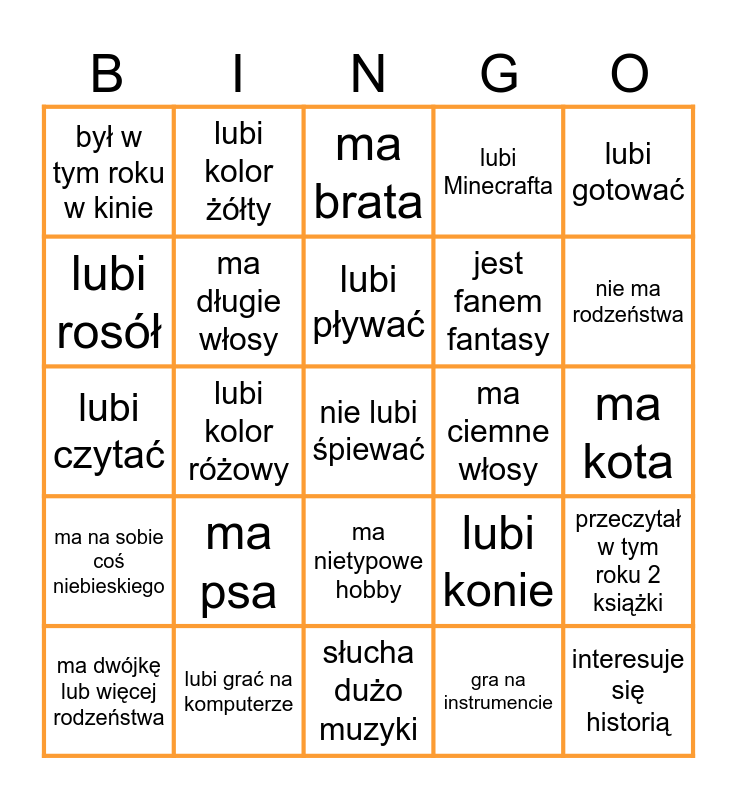 This bingo card has a free space and 24 words: ma psa, lubi grać na komputerze, lubi pływać, ma dwójkę lub więcej rodzeństwa, lubi gotować, był w tym roku w kinie, lubi rosół, lubi kolor żółty, ma ciemne włosy, ma nietypowe hobby, jest fanem fantasy, lubi czytać, lubi konie, przeczytał w tym roku 2 książki, ma długie włosy, gra na instrumencie, ma kota, ma brata, nie ma rodzeństwa, lubi kolor różowy, interesuje się historią, ma na sobie coś niebieskiego, lubi Minecrafta and słucha dużo muzyki.