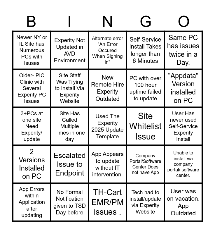 This bingo card has a free space and 24 words: Escalated Issue to Endpoint, No Formal Notification given to TSD Day before, New Remote Hire Experity Outdated, App Errors within Application after updating, Same PC has issues twice in a Day., Newer NY or IL Site has Numerous PCs with Isuses, Older- PIC Clinic with Several Experity PC Issues, Experity Not Updated in AVD Environment, Site Whitelist Issue, App Appears to update without IT intervention., PC with over 100 hour uptime failed to update, 3+PCs at one site Need Experity/ update, Company Portal/Software Center Does not have App, Unable to install via company portal/ software center., Site Staff Was Trying to Install Via Experity Website, Tech had to install/update via Experity Website, User Has never used Self-Service Experity Install, Alternate error "An Error Occured When Signing in", "Appdata" Version installed on PC, Site Has Called Multiple Times in one day, User was on vacation. App Outdated, 2 Versions Installed on PC, Self-Service Install Takes longer than 6 Minutes and TH-Cart EMR/PM issues ..