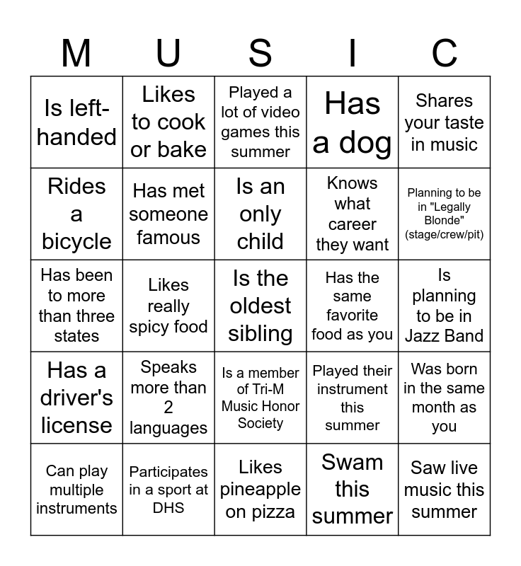 This bingo card has 25 words: Speaks more than 2 languages, Likes pineapple on pizza, Is an only child, Can play multiple instruments, Shares your taste in music, Is left-handed, Rides a bicycle, Likes to cook or bake, Has the same favorite food as you, Is a member of Tri-M Music Honor Society, Knows what career they want, Has been to more than three states, Played their instrument this summer, Was born in the same month as you, Has met someone famous, Saw live music this summer, Is planning to be in Jazz Band, Played a lot of video games this summer, Planning to be in "Legally Blonde" (stage/crew/pit), Likes really spicy food, Is the oldest sibling, Participates in a sport at DHS, Has a driver's license, Has a dog and Swam this summer.