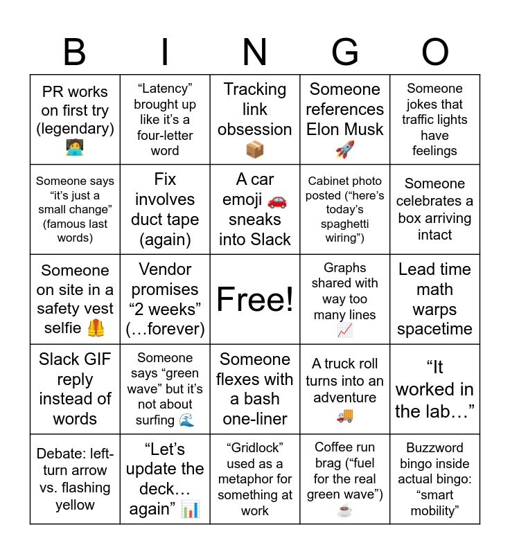 This bingo card has a free space and 25 words: Someone says “green wave” but it’s not about surfing 🌊, “Gridlock” used as a metaphor for something at work, A car emoji 🚗 sneaks into Slack, Debate: left-turn arrow vs. flashing yellow, Someone jokes that traffic lights have feelings, PR works on first try (legendary) 🧑💻, Someone says “it’s just a small change” (famous last words), “Latency” brought up like it’s a four-letter word, Graphs shared with way too many lines 📈, Someone flexes with a bash one-liner, Cabinet photo posted (“here’s today’s spaghetti wiring”), Someone on site in a safety vest selfie 🦺, A truck roll turns into an adventure 🚚, “It worked in the lab…”, Fix involves duct tape (again), A part is “stuck at customs” ✈️, Lead time math warps spacetime, Tracking link obsession 📦, Someone celebrates a box arriving intact, Vendor promises “2 weeks” (…forever), Buzzword bingo inside actual bingo: “smart mobility”, “Let’s update the deck… again” 📊, Slack GIF reply instead of words, Someone references Elon Musk 🚀 and Coffee run brag (“fuel for the real green wave”) ☕.
