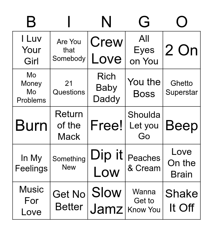 This bingo card has a free space and 24 words: Something New, Get No Better, Rich Baby Daddy, Music For Love, 2 On, I Luv Your Girl, Mo Money Mo Problems, Are You that Somebody, Shoulda Let you Go, Dip it Low, You the Boss, Burn, Peaches & Cream, Love On the Brain, 21 Questions, Wanna Get to Know You, Beep, Crew Love, Ghetto Superstar, Return of the Mack, Shake It Off, In My Feelings, All Eyes on You and Slow Jamz.