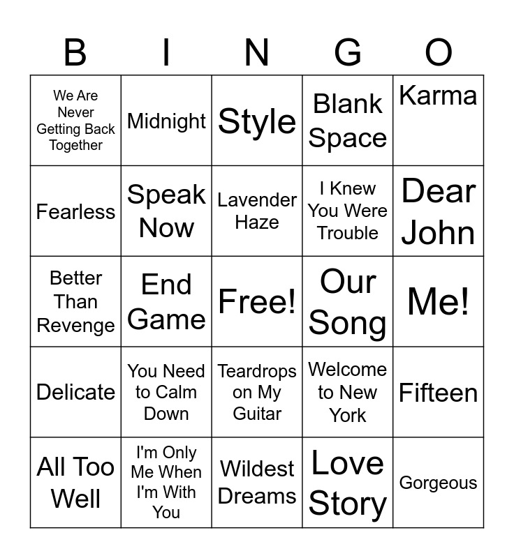 This bingo card has a free space and 24 words: You Need to Calm Down, I'm Only Me When I'm With You, Lavender Haze, All Too Well, Karma, We Are Never Getting Back Together, Fearless, Midnight, Our Song, Teardrops on My Guitar, I Knew You Were Trouble, Better Than Revenge, Welcome to New York, Fifteen, Speak Now, Love Story, Me!, Style, Dear John, End Game, Gorgeous, Delicate, Blank Space and Wildest Dreams.