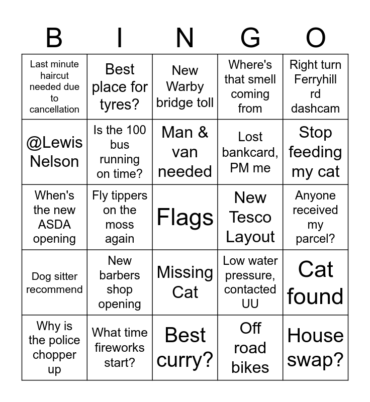 This bingo card has a free space and 24 words: New barbers shop opening, What time fireworks start?, Man & van needed, Why is the police chopper up, Right turn Ferryhill rd dashcam, Last minute haircut needed due to cancellation, @Lewis Nelson, Best place for tyres?, New Tesco Layout, Missing Cat, Lost bankcard, PM me, When's the new ASDA opening, Low water pressure, contacted UU, Cat found, Is the 100 bus running on time?, Off road bikes, Anyone received my parcel?, New Warby bridge toll, Stop feeding my cat, Fly tippers on the moss again, House swap?, Dog sitter recommend, Where's that smell coming from and Best curry?.