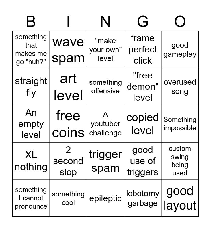 This bingo card has a free space and 24 words: 2 second slop, something cool, something offensive, something I cannot pronounce, good gameplay, something that makes me go "huh?", straight fly, wave spam, copied level, trigger spam, "free demon" level, An empty level, good use of triggers, custom swing being used, art level, lobotomy garbage, Something impossible, "make your own" level, overused song, free coins, good layout, XL nothing, frame perfect click and epileptic.