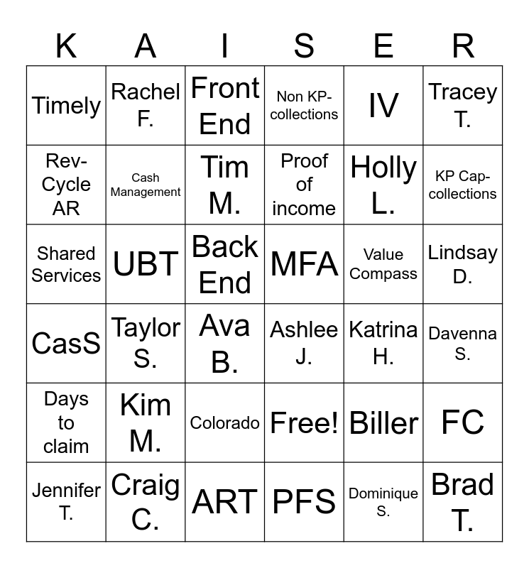 This bingo card has 36 words: Free!, Colorado, PFS, Rev-Cycle AR, CasS, MFA, Cash Management, ART, IV, Biller, KP Cap-collections, Non KP-collections, FC, UBT, Proof of income, Timely, Days to claim, Value Compass, Shared Services, Front End, Back End, Taylor S., Ashlee J., Ava B., Katrina H., Rachel F., Holly L., Craig C., Tim M., Tracey T., Brad T., Jennifer T., Davenna S., Lindsay D., Kim M. and Dominique S..