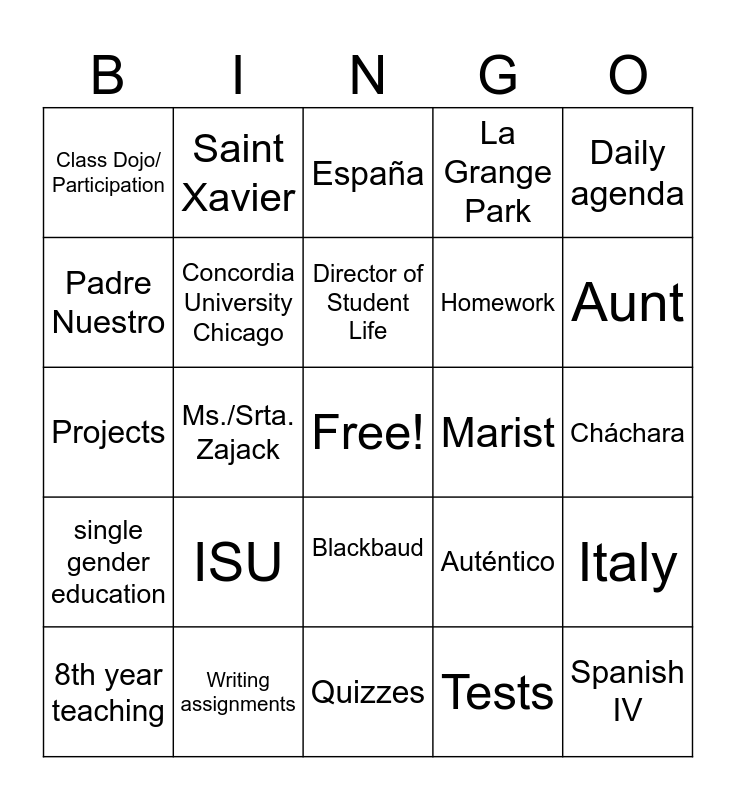 This bingo card has a free space and 24 words: ISU, Writing assignments, Director of Student Life, 8th year teaching, Daily agenda, Class Dojo/ Participation, Padre Nuestro, Saint Xavier, Marist, Blackbaud, Homework, Projects, Auténtico, Italy, Concordia University Chicago, Tests, Cháchara, España, Aunt, Ms./Srta. Zajack, Spanish IV, single gender education, La Grange Park and Quizzes.