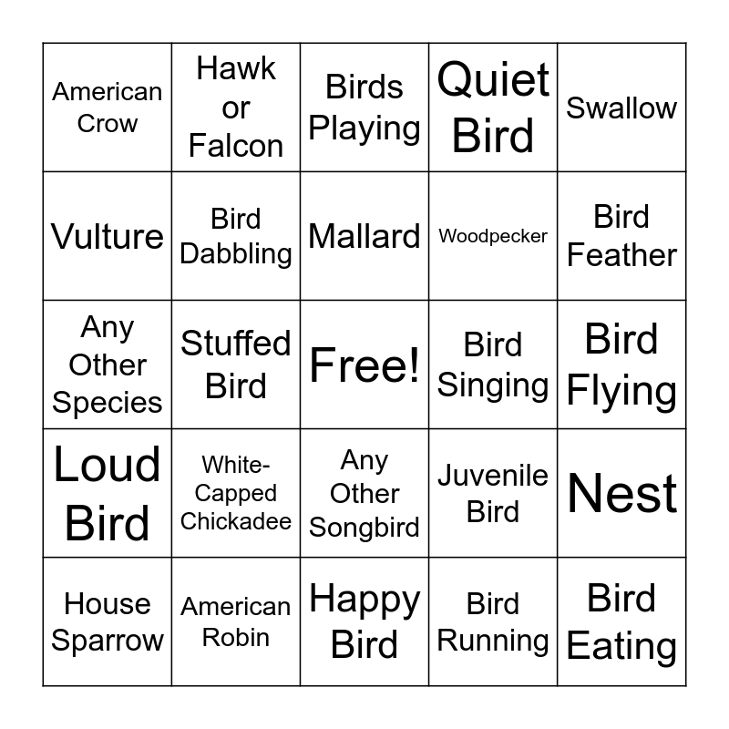This bingo card has a free space and 24 words: White-Capped Chickadee, American Robin, Mallard, House Sparrow, Swallow, American Crow, Vulture, Hawk or Falcon, Bird Singing, Any Other Songbird, Woodpecker, Any Other Species, Juvenile Bird, Nest, Bird Dabbling, Bird Running, Bird Flying, Birds Playing, Bird Feather, Stuffed Bird, Bird Eating, Loud Bird, Quiet Bird and Happy Bird.