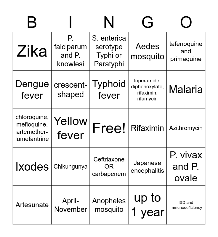 This bingo card has a free space and 24 words: Chikungunya, April-November, Typhoid fever, Artesunate, tafenoquine and primaquine, Zika, Dengue fever, P. falciparum and P. knowlesi, Rifaximin, Ceftriaxone OR carbapenem, loperamide, diphenoxylate, rifaximin, rifamycin, chloroquine, mefloquine, artemether-lumefantrine, Japanese encephalitis, P. vivax and P. ovale, crescent-shaped, up to 1 year, Azithromycin, S. enterica serotype Typhi or Paratyphi, Malaria, Yellow fever, IBD and immunodeficiency, Ixodes, Aedes mosquito and Anopheles mosquito.