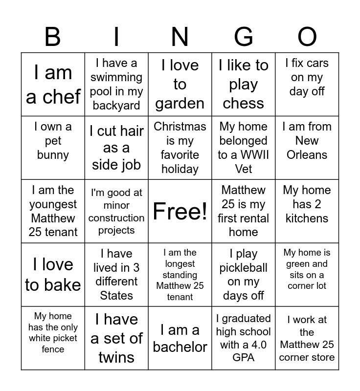 This bingo card has a free space and 24 words: I have lived in 3 different States, I have a set of twins, Christmas is my favorite holiday, My home has the only white picket fence, I fix cars on my day off, I am a chef, I own a pet bunny, I have a swimming pool in my backyard, Matthew 25 is my first rental home, I am the longest standing Matthew 25 tenant, My home belonged to a WWII Vet, I am the youngest Matthew 25 tenant, I play pickleball on my days off, My home is green and sits on a corner lot, I cut hair as a side job, I graduated high school with a 4.0 GPA, My home has 2 kitchens, I love to garden, I am from New Orleans, I'm good at minor construction projects, I work at the Matthew 25 corner store, I love to bake, I like to play chess and I am a bachelor.