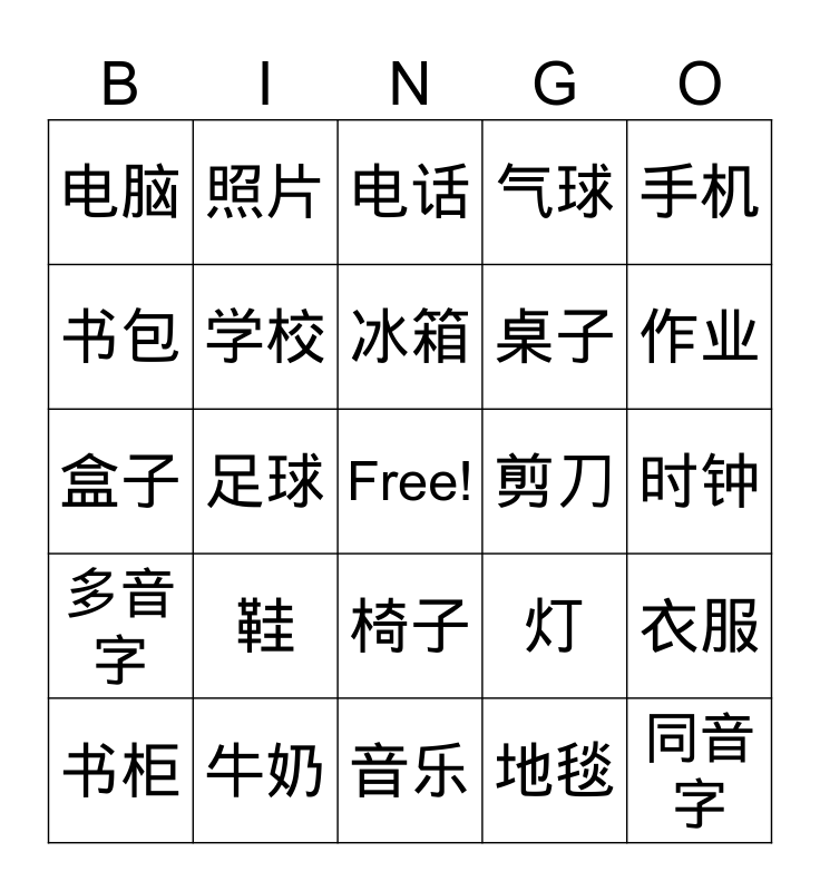 This bingo card has a free space and 24 words: 鞋, 牛奶, 冰箱, 书柜, 手机, 电脑, 书包, 照片, 剪刀, 椅子, 桌子, 盒子, 灯, 衣服, 学校, 地毯, 时钟, 电话, 作业, 足球, 同音字, 多音字, 气球 and 音乐.