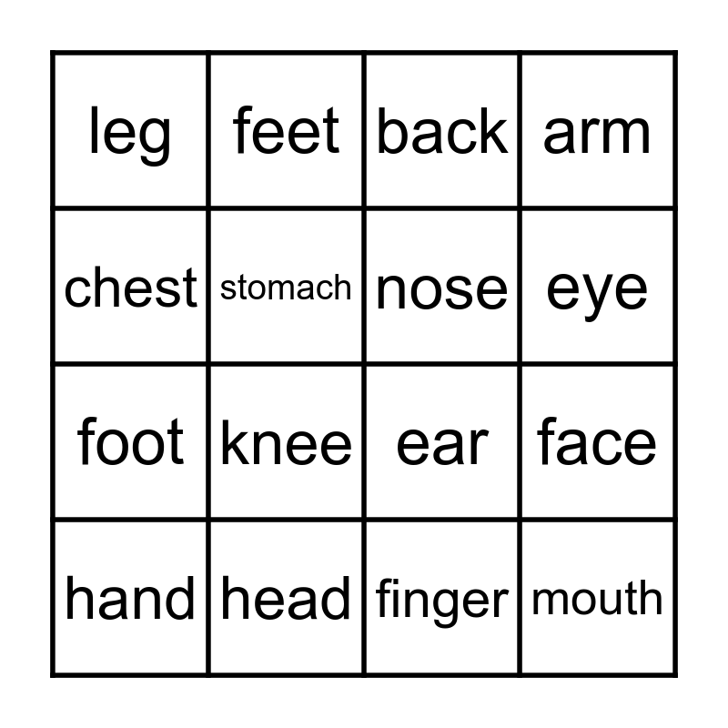 This bingo card has 16 words: head, face, back, leg, foot, feet, ear, finger, chest, stomach, hand, arm, knee, eye, nose and mouth.