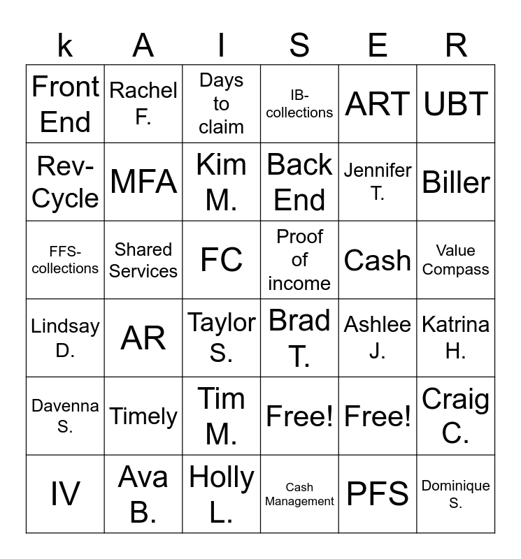 This bingo card has 37 words: Free!, Free!, PFS, Rev-Cycle, AR, Cash, MFA, Cash Management, ART, IV, Biller, IB- collections, FFS- collections, FC, UBT, Proof of income, Timely, Days to claim, Value Compass, Shared Services, Front End, Back End, Taylor S., Ashlee J., Ava B., Katrina H., Rachel F., Holly L., Craig C., Tim M., Tracey T., Brad T., Jennifer T., Davenna S., Lindsay D., Kim M. and Dominique S..