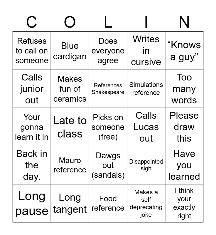 This bingo card has a free space and 26 words: Dawgs out (sandals), Makes a self deprecating joke, References Shakespeare, Long tangent, “Knows a guy”, Refuses to call on someone, Calls junior out, Blue cardigan, Please draw this, Disappointed sigh, Simulations reference, Your gonna learn it in, Have you learned, Long pause, Late to class, Will you come up and write, Writes in cursive, Back in the day., Does everyone agree, I think your exactly right, Too many words, Food reference, Calls Lucas out, Mauro reference, Makes fun of ceramics and Calls on backrow.