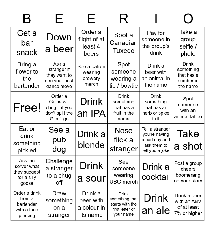 This bingo card has 36 words: See someone wearing UBC merch, Drink a sour, Drink something that starts with the first letter of your name, Bring a flower to the bartender, Eat or drink something pickled, Drink something that has a fruit in the name, Ask a stranger if they want to see your best dance move, Drink a beer with a colour in its name, Pay for someone in the group's drink, Drink a cocktail, Drink something that has a number in the name, Spot a Canadian Tuxedo, Post a group cheers boomerang on your story, Order a Guiness - chug it if you don't split the G in 1 go, Spot someone wearing a tie / bowtie, Get a bar snack, Ask the server what they suggest for a silly goose, Drink something that has an herb or spice in it, Free!, Order a flight of at least 4 beers, Drink an IPA, See a pub dog, Nose flick a stranger, Drink a blonde, Tell a stranger you're having a bad day and ask them to tell you a joke, Down a beer, Drink a beer with an animal in the name, Draw something on a stranger, See a patron wearing brewery merch, Take a group selfie / photo, Drink a beer with an ABV of at least 7% or higher, Order a drink from a bartender with a face piercing, Take a shot, Spot someone with an animal tattoo, Challenge a stranger to a chug off and Drink an ale.