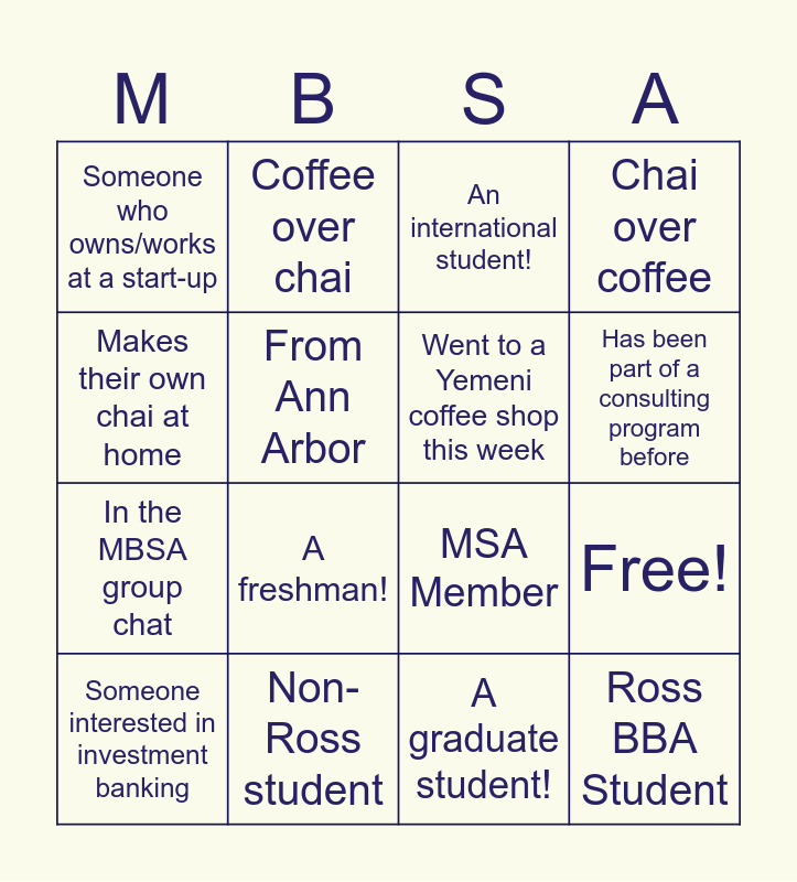 This bingo card has 16 words: Non-Ross student, Free!, An international student!, Someone who owns/works at a start-up, In the MBSA group chat, Coffee over chai, MSA Member, A graduate student!, Makes their own chai at home, From Ann Arbor, Someone interested in investment banking, Chai over coffee, A freshman!, Has been part of a consulting program before, Went to a Yemeni coffee shop this week and Ross BBA Student.