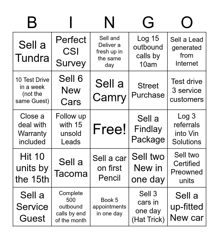This bingo card has a free space and 24 words: Sell a Tacoma, Complete 500 outbound calls by end of the month, Sell a Camry, Sell a Service Guest, Sell a Lead generated from Internet, Sell a Tundra, 10 Test Drive in a week (not the same Guest), Perfect CSI Survey, Sell a Findlay Package, Sell a car on first Pencil, Street Purchase, Close a deal with Warranty included, Sell two New in one day, Sell two Certified Preowned units, Sell 6 New Cars, Sell 3 cars in one day (Hat Trick), Log 3 referrals into Vin Solutions, Sell and Deliver a fresh up in the same day, Test drive 3 service customers, Follow up with 15 unsold Leads, Sell a up-fitted New car, Hit 10 units by the 15th, Log 15 outbound calls by 10am and Book 5 appointments in one day.