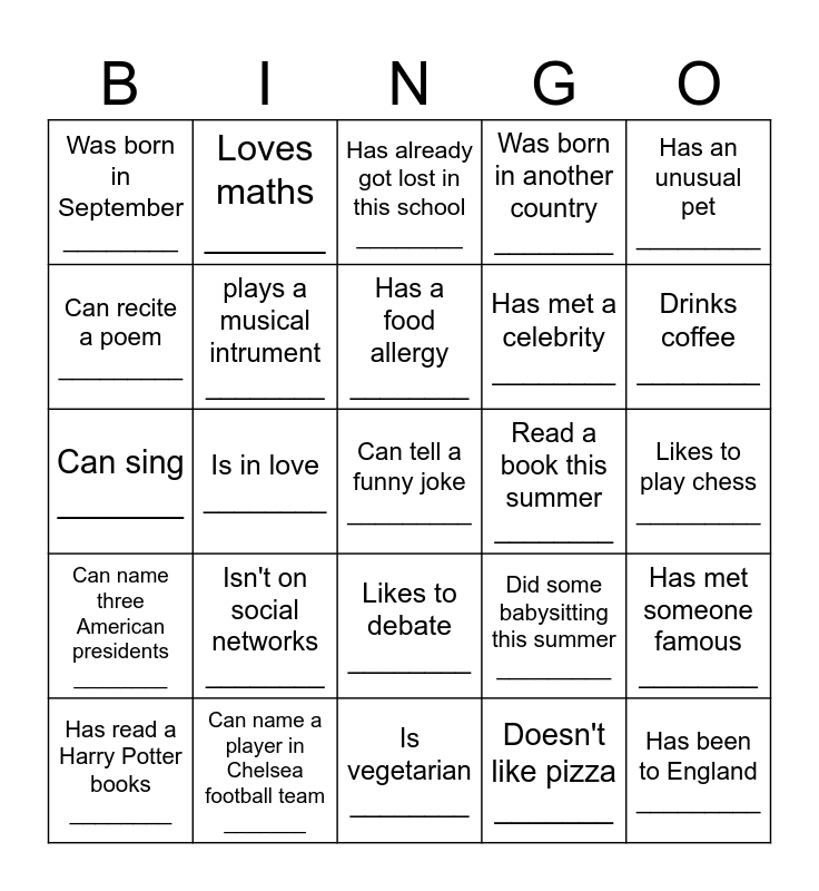 This bingo card has 25 words: Can name three American presidents ________, Can name a player in Chelsea football team _______, Can tell a funny joke _________, Doesn't like pizza _______, Has an unusual pet _________, Was born in September ________, Loves maths ______, Has already got lost in this school ________, Read a book this summer ________, Has met someone famous ________, Can recite a poem _________, plays a musical intrument ________, Is vegetarian ________, Did some babysitting this summer _________, Drinks coffee ________, Has read a Harry Potter books ________, Is in love ________, Has a food allergy ________, Has met a celebrity ________, Likes to play chess _________, Can sing _______, Isn't on social networks ________, Likes to debate ________, Was born in another country ________ and Has been to England _________.