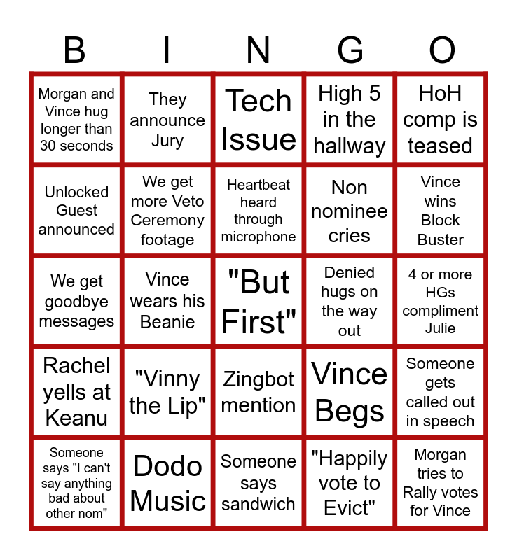 This bingo card has a free space and 59 words: Lauren doesn't get a DR, Dodo Music, Julie has her hair down, Rachel yells at Keanu, "Happily vote to Evict", Ava says "Frankly", We get more Veto Ceremony footage, Vinny cries after Block Buster, Non nominee cries, "Sadly vote to evict" followed by excited shoutouts, High 5 in the hallway, No scrambling just hugs, Unlocked Guest announced, Rachel wears Red, Mastermind face reveal, Morgan and Vince hug longer than 30 seconds, Morgan tries to Rally votes for Vince, HoH comp is teased, New Twist ReveaL, Heartbeat heard through microphone, Denied hugs on the way out, Tech Issue, Someone says "I can't say anything bad about other nom", Someone gets called out in speech, Credit music to loud to hear HGs, Julie has to yell at HG to leave multiple times, Double Eviction announced for Next Week, Mickey wins Block Buster, Vince wins Block Buster, Ashley wins Block Buster, HG wear coordinated outfits, Vote count 4-3, Unanimous Vote, Keanu cries, They announce Jury, we see the photo gray out live, Julie announces Block Buster is done, Vince wears his Beanie, Chocolate Drop mention, We get goodbye messages, Ava pauses while voting, "Vinny the Lip", 4 or more HGs compliment Julie, Vince Evicted, Mickey Evicted, Mastermind directly speaks to the HGs, Curse word bleep, Keanu makes his signature hug pose, Zingbot mention, Someone says sandwich, Angela mention, Evicted HG says they felt betrayed by someone, Morgan wears Veto in conversation, Talk of Rachel being targeted, Judges Reveal, Vince Begs, Vince says "This is my dream", "Do whats best for your game" and Someone doesn't do a shoutout when they go in to Vote..