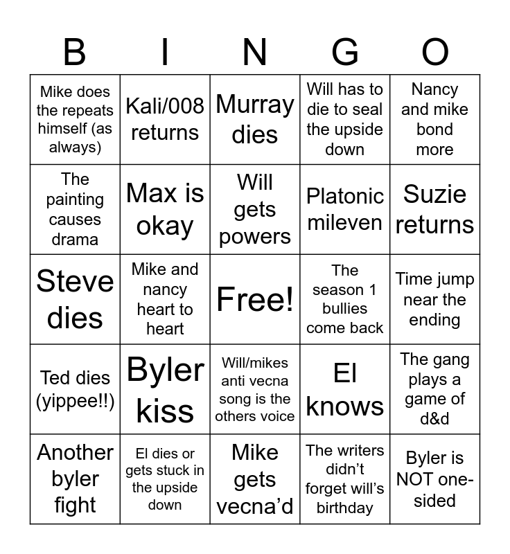 This bingo card has a free space and 24 words: Byler kiss, El dies or gets stuck in the upside down, Will gets powers, Another byler fight, Nancy and mike bond more, Mike does the repeats himself (as always), The painting causes drama, Kali/008 returns, The season 1 bullies come back, Will/mikes anti vecna song is the others voice, Platonic mileven, Steve dies, El knows, The gang plays a game of d&d, Max is okay, The writers didn’t forget will’s birthday, Time jump near the ending, Murray dies, Suzie returns, Mike and nancy heart to heart, Byler is NOT one-sided, Ted dies (yippee!!), Will has to die to seal the upside down and Mike gets vecna’d.